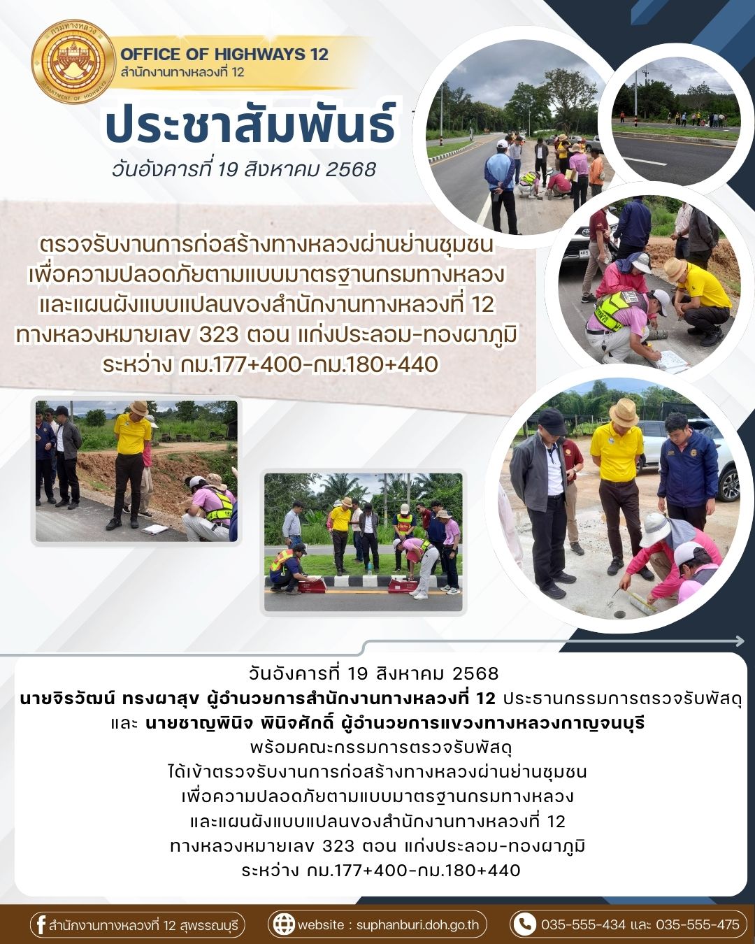 ตรวจรับงานการก่อสร้างทางหลวงผ่านย่านชุมชน เพื่อความปลอดภัยตามแบบมาตรฐานกรมทางหลวง และแผนผังแบบแปลนของสำนักงานทางหลวงที่ 12 ทางหลวงหมายเลข 323 ตอน แก่งประลอม-ทองผาภูมิ ระหว่าง กม.177+400-กม.180+440
