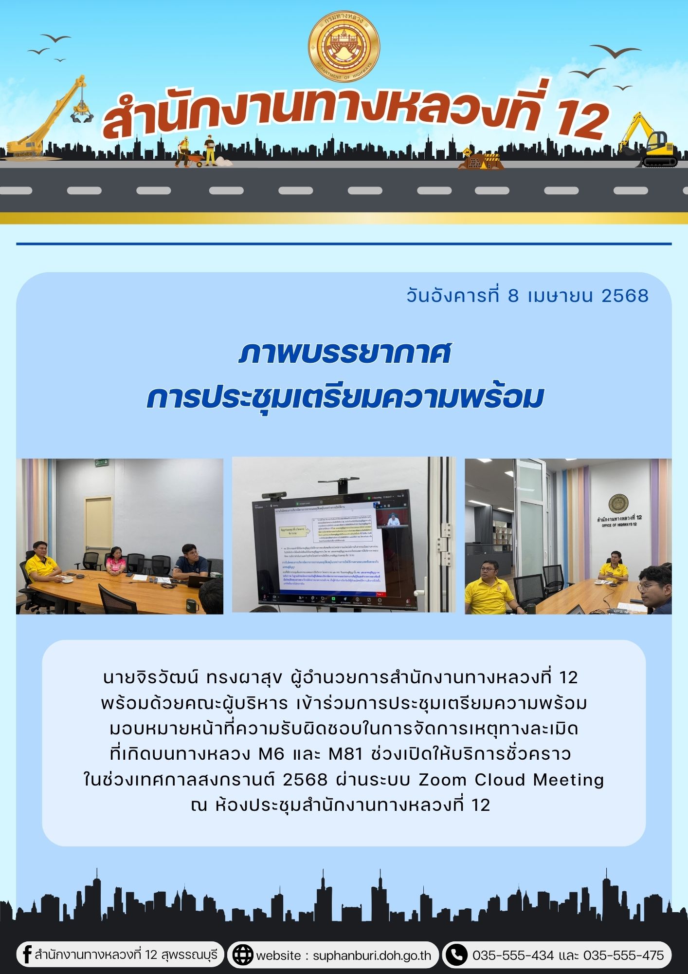 ภาพบรรยากาศ การประชุมเตรียมความพร้อมมอบหมายหน้าที่ความรับผิดชอบในการจัดการเหตุทางละเมิด ที่เกิดบนทางหลวง M6 และ M81 ช่วงเปิดให้บริการชั่วคราว ในช่วงเทศกาลสงกรานต์ 2568