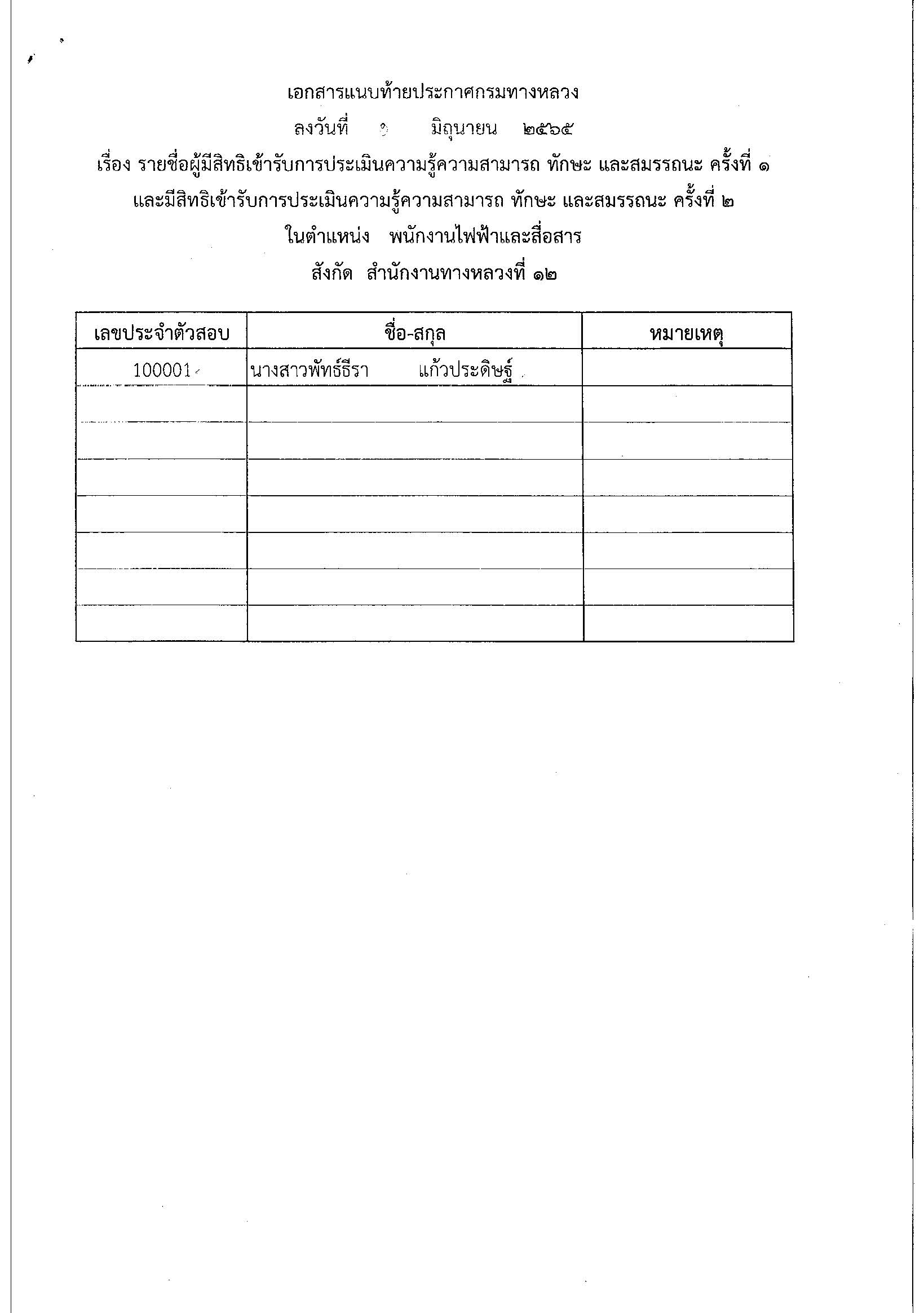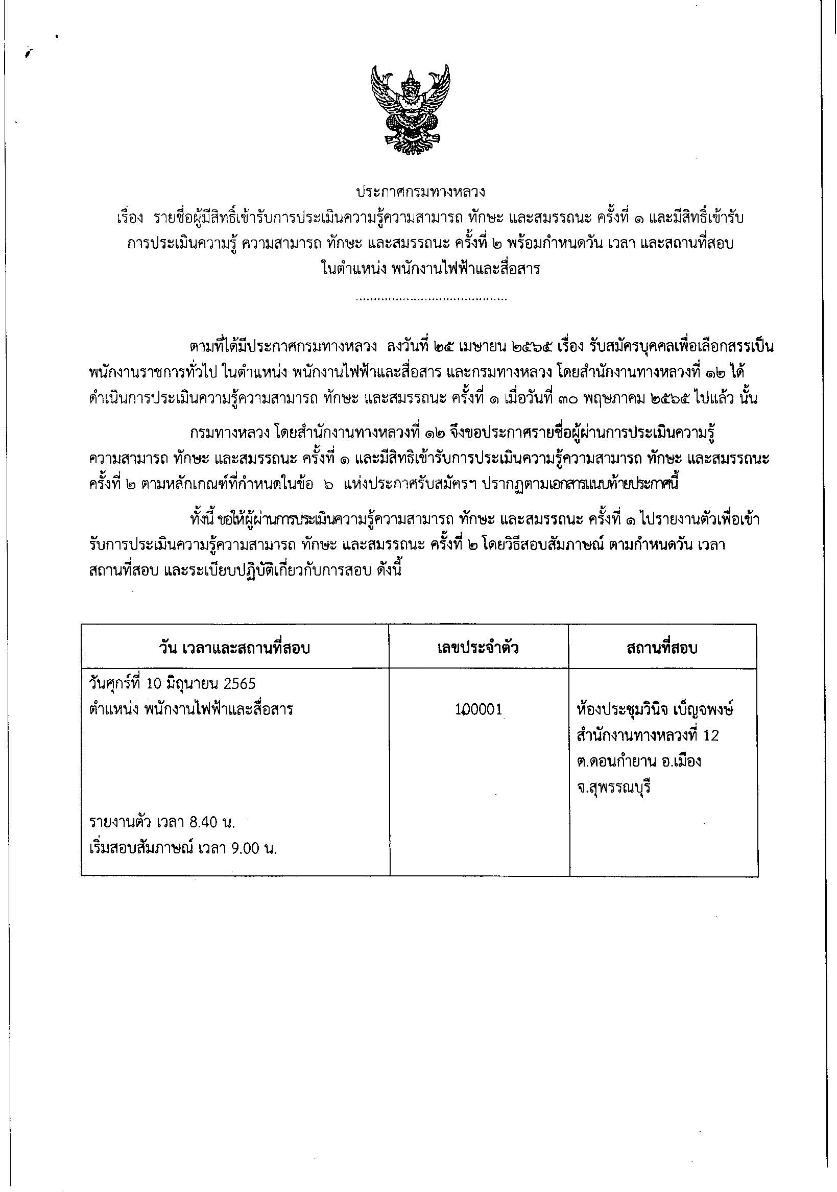 รายชื่อผู้มีสิทธิ์เข้ารับการประเมินความรู้ความสามารถ ทักษะ และสมรรถนะ ครั้งที่1 และมีสิทธิ์เข้ารับการประเมินความรู้ ความสามารถ ทักษะ และสมรรถนะ ครั้งที่ ๒ พร้อมกำหนดวัน เวลา และสถานที่สอบ ในตำแหน่ง พนักงานไฟฟ้าและสื่อสาร