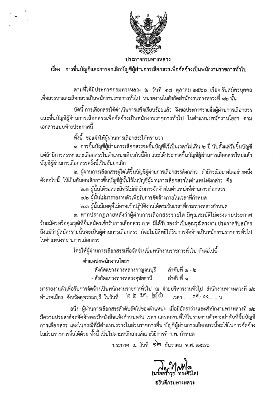 ขอประกาศรายชื่อผู้ผ่านการเลือกสรรและขึ้นบัญชีผู้ผ่านการเลือกสรรเพื่อจัดจ้างเป็นพนักงานราชการทั่วไป ในตำแหน่งพนักงานโยธา หน่วยงานในสังกัดสำนักงานกรมทางหลวงที่ 12