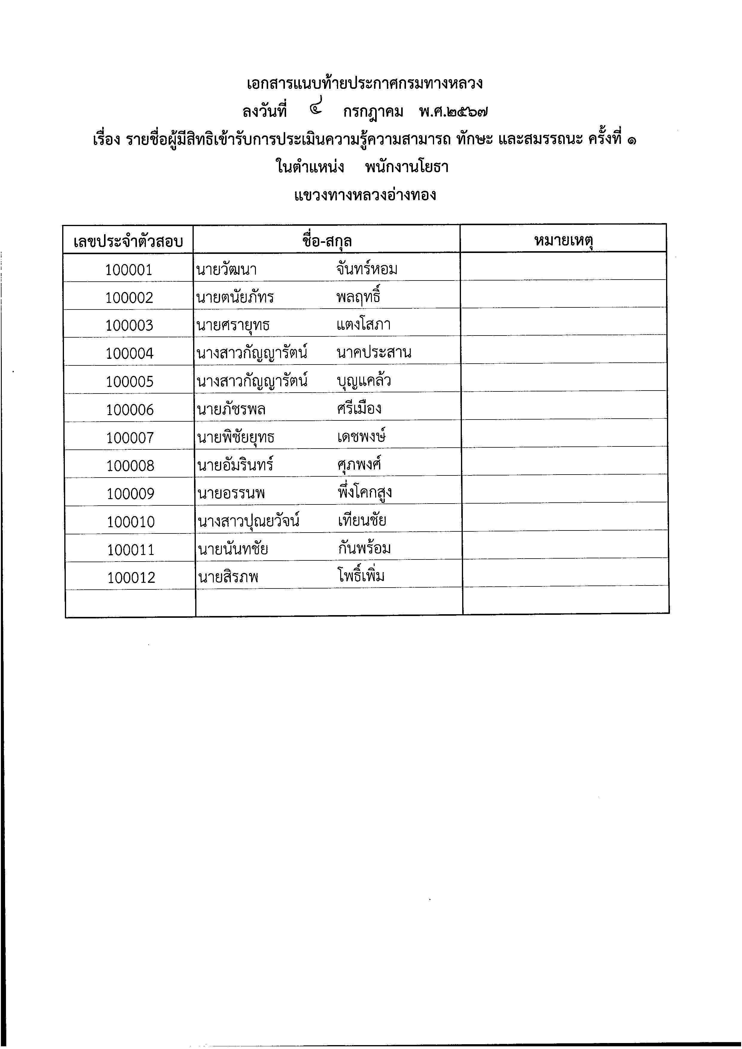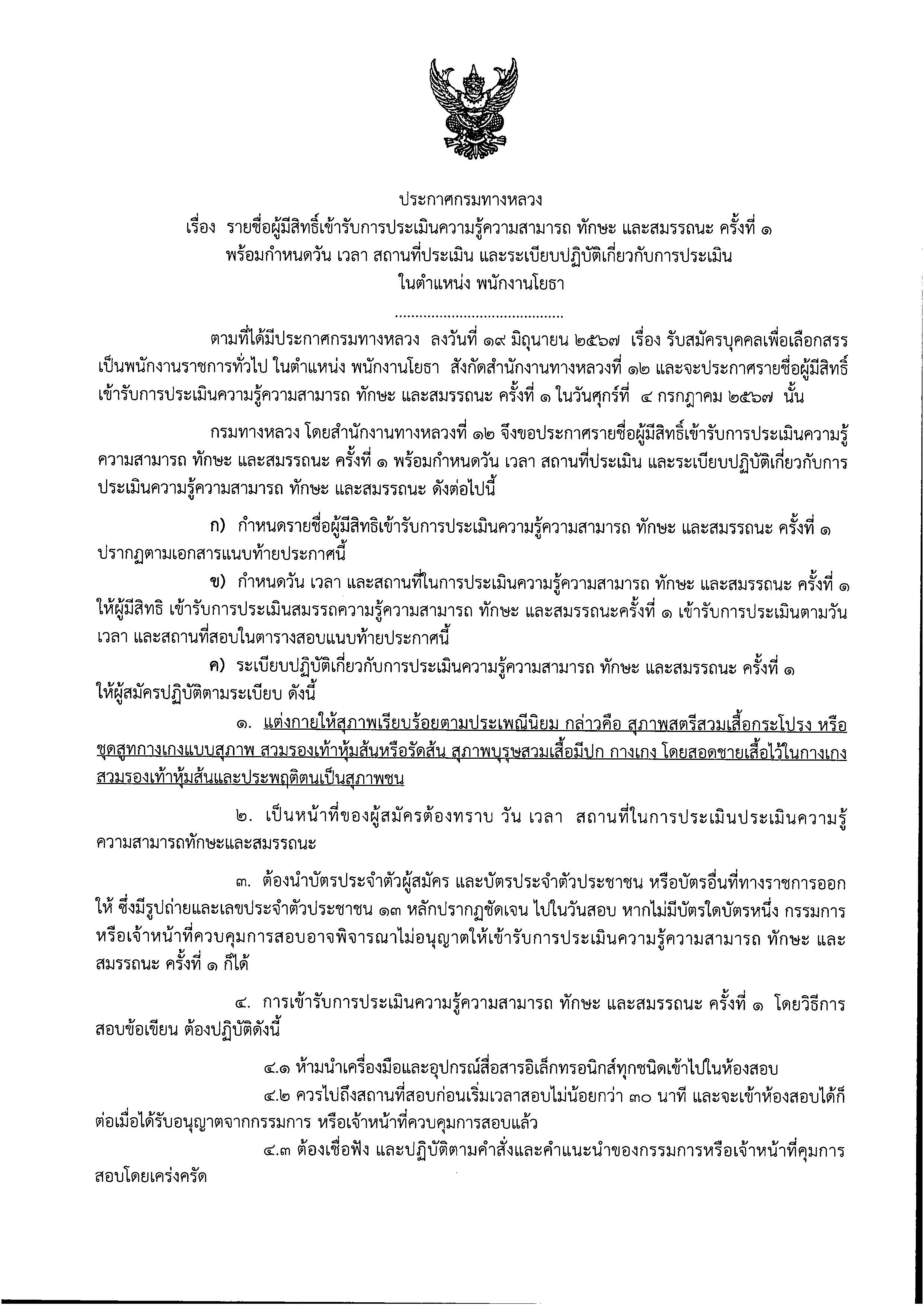 รายชื่อผู้มีสิทธิ์เข้ารับการประเมินความรู้ความสามารถ ทักษะ และสมรรถนะ ครั้งที่1 พร้อมกำหนดวัน เวลา และสถานที่ประเมิน และระเบียบปฏิบัติเกี่ยวกับการประเมิน ในตำแหน่ง พนักงานโยธา