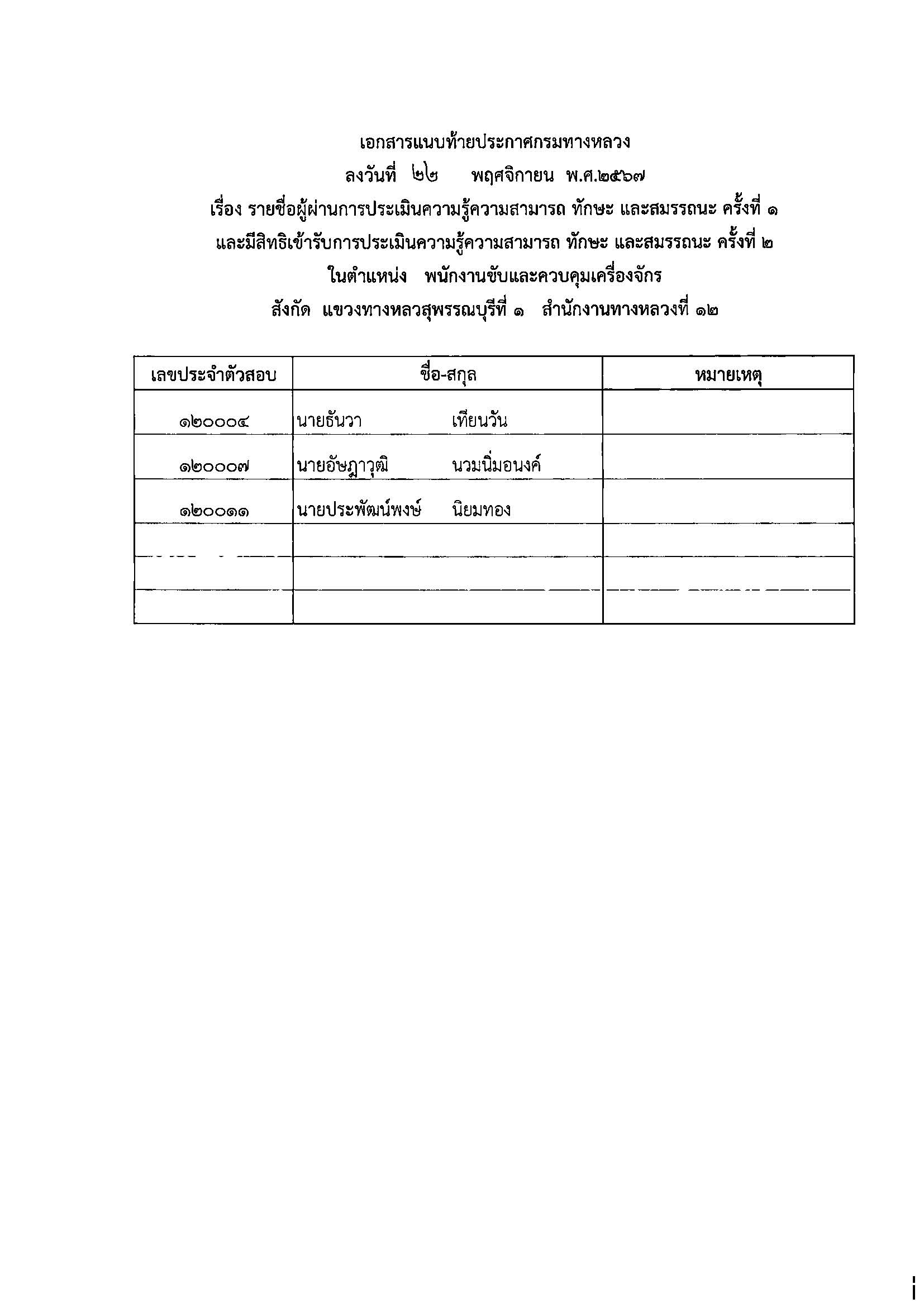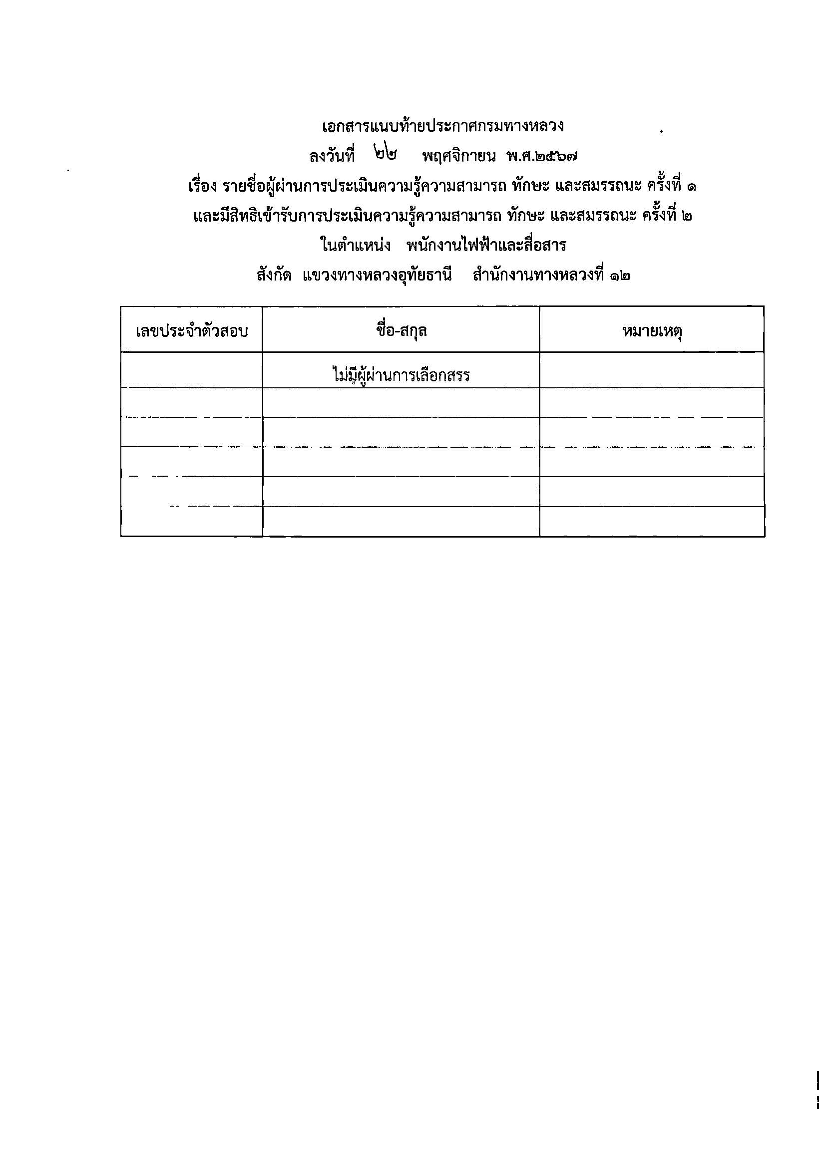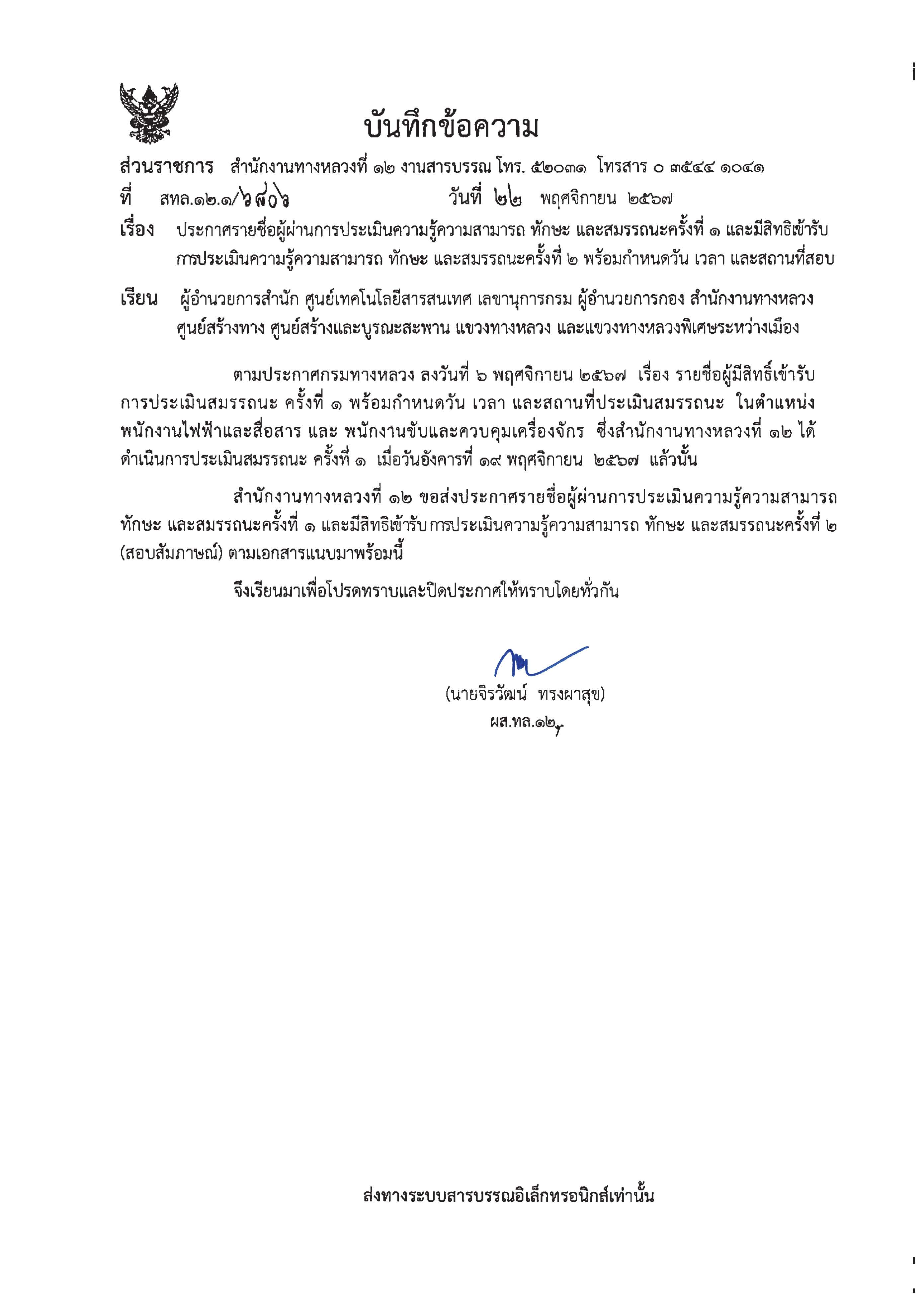 รายชื่อผู้มีสิทธิ์เข้ารับการประเมินความรู้ความสามารถ ทักษะ และสมรรถนะ ครั้งที่1 และมีสิทธิ์เข้ารับการประเมินความรู้ ความสามารถ ทักษะ และสมรรถนะ ครั้งที่ ๒ พร้อมกำหนดวัน เวลา และสถานที่สอบ ในตำแหน่ง พนักงานไฟฟ้าสื่อสาร , พนักงานขับและควบคุมเครื่องจักร