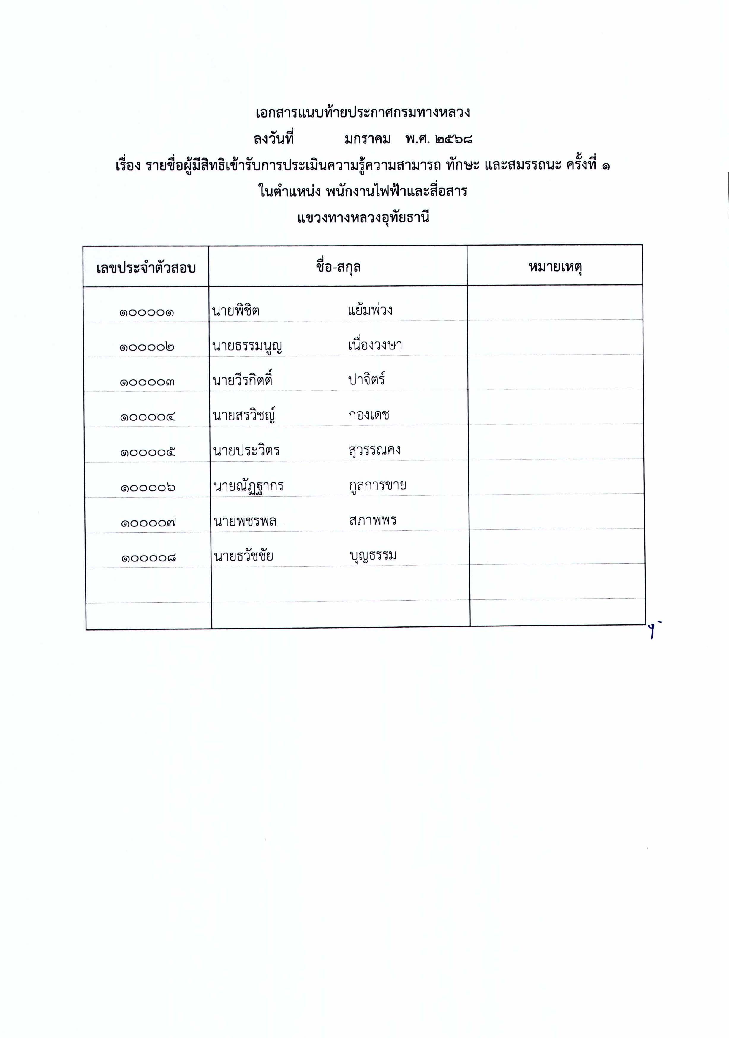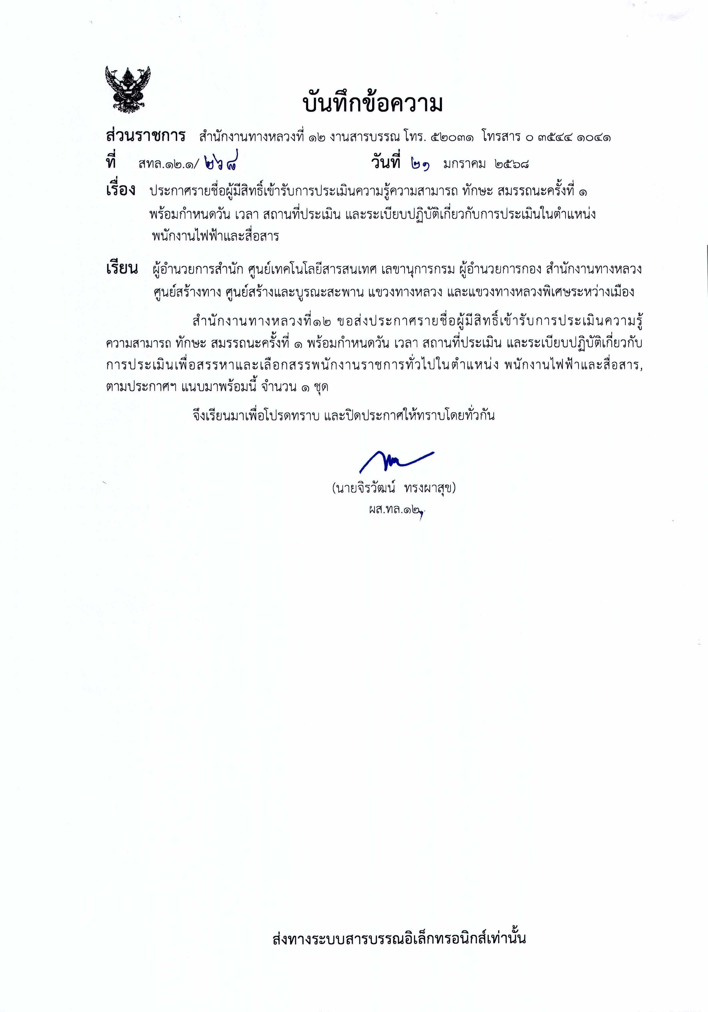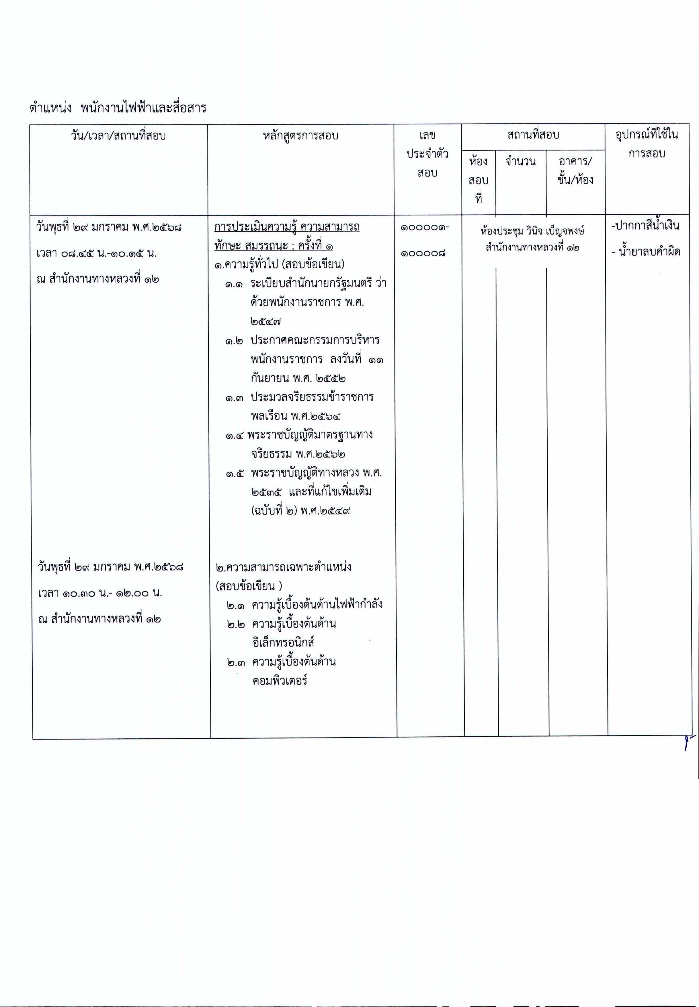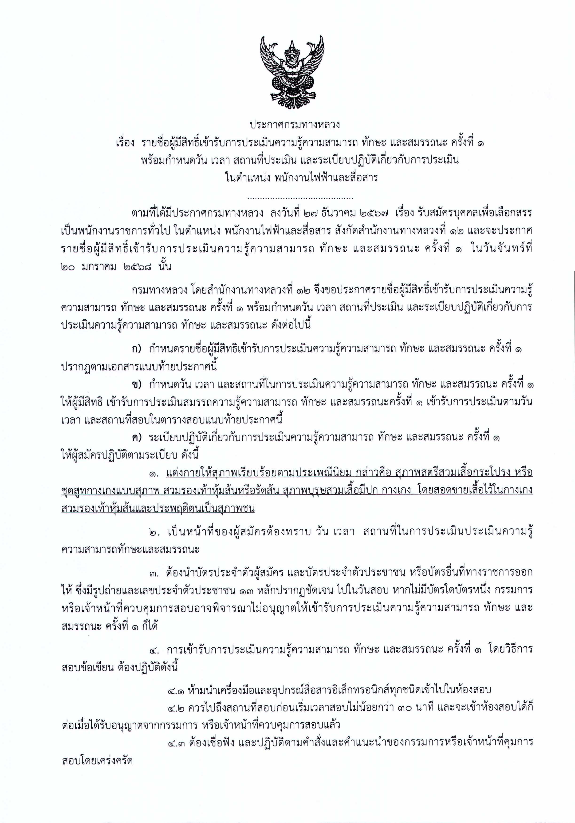 รายชื่อผู้มีสิทธิ์เข้ารับการประเมินความรู้ความสามารถ ทักษะ และสมรรถนะ ครั้งที่1 พร้อมกำหนดวัน เวลา สถานที่ประเมิน และระเบียบปฏิบัติเกี่ยวกับการประเมิน ในตำแหน่ง พนักงานไฟฟ้าและสื่อสาร